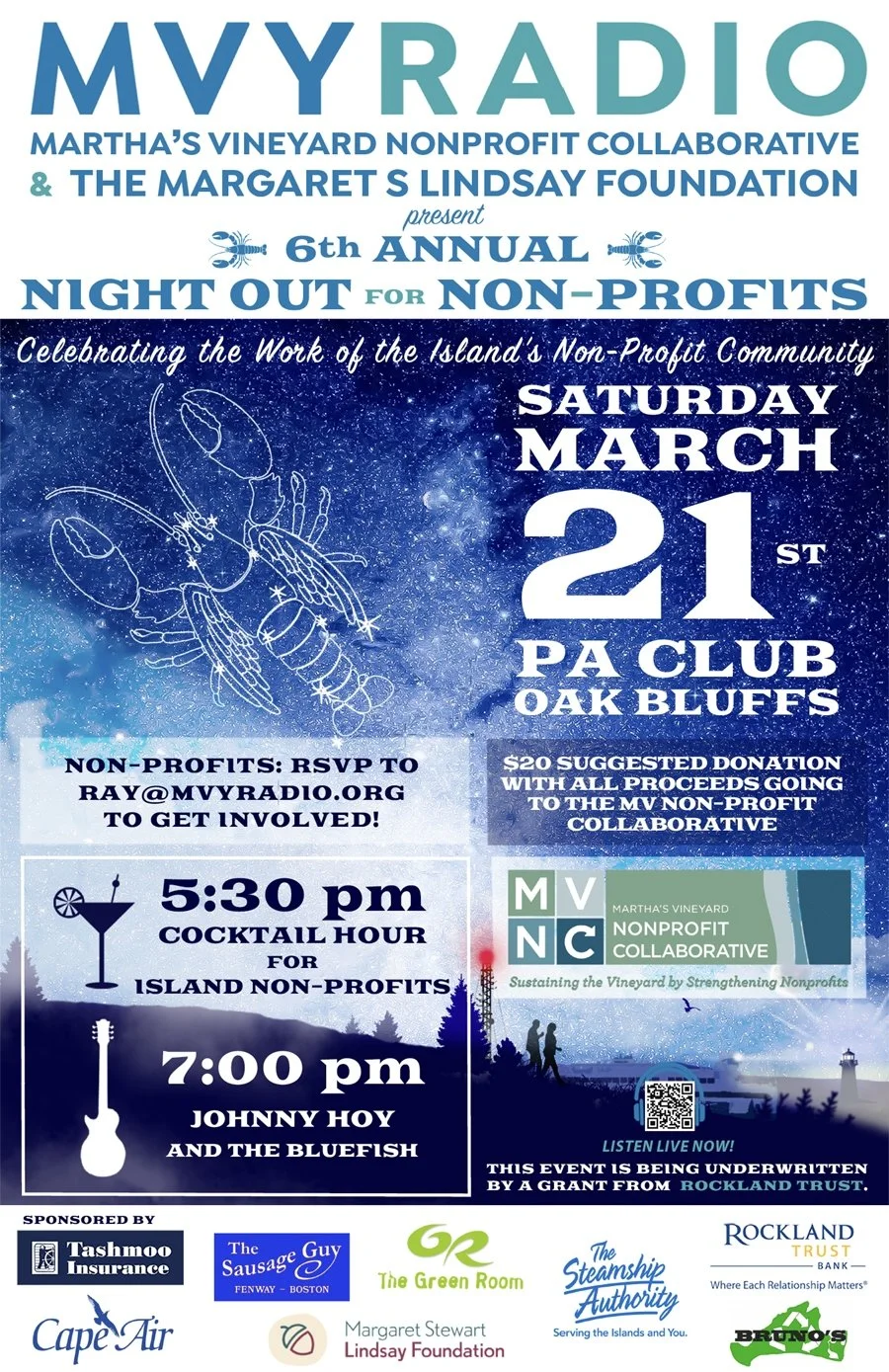 Back to All Events MVY Radio Night Out for Non-Profits Saturday, March 21, 2026 5:30 PM 9:30 PM Google Calendar ICS